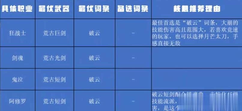 此次赠送的自选荒古礼盒是真正完全自选,**大家不仅能自选武器种类**,像狂战士必然会自选荒古巨剑。而且这自选的荒古巨剑还能自选四种特化词条,普通玩家可能直接就选了月芒词条,可实际上狂战士的毕业词条是破云,其伤害比其他词条高不少。其他鬼剑士职业也最好选择破云,要是不知道选什么词条,无脑选破云即可。